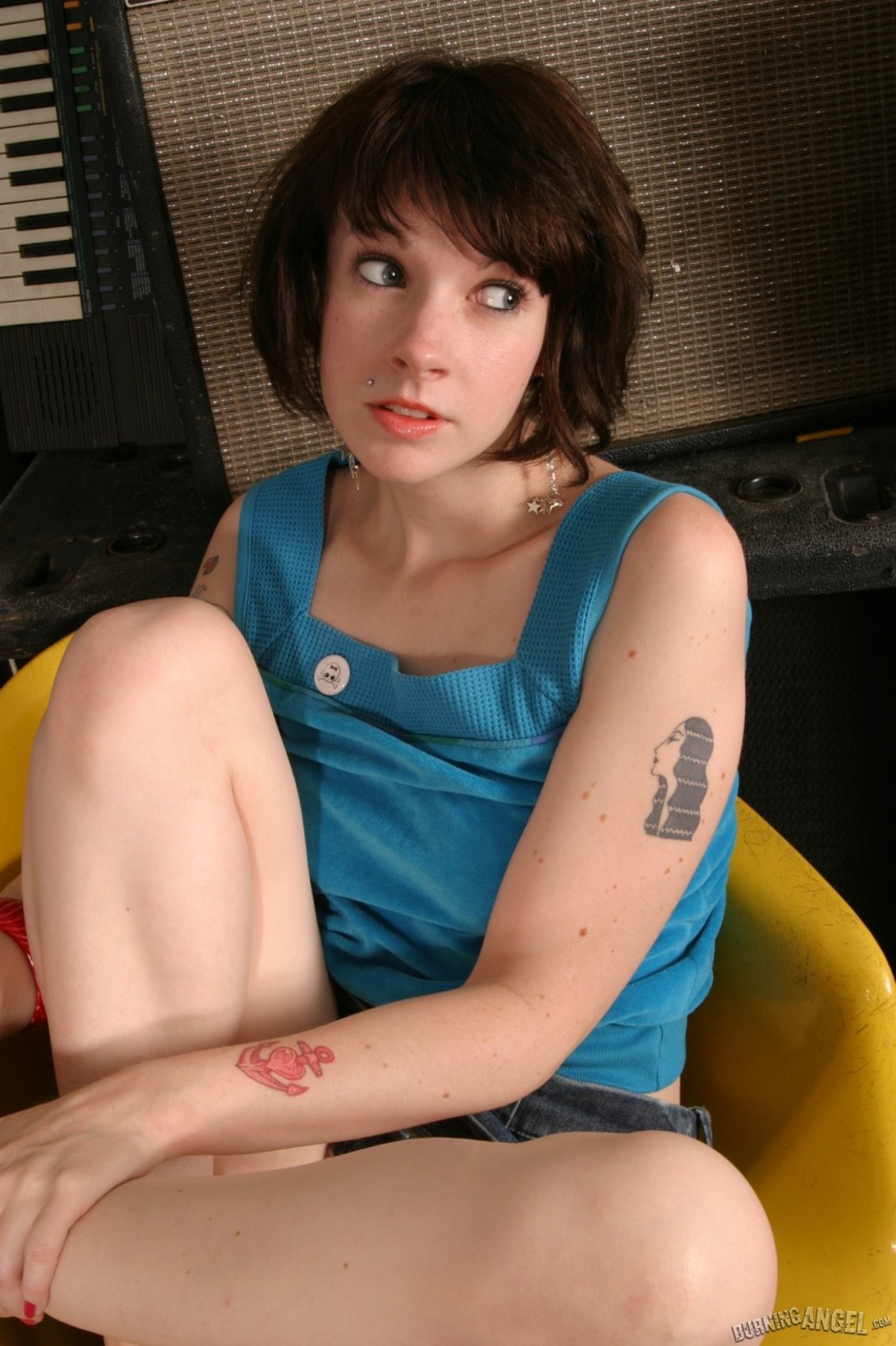 Cute young brunette Anouck shows off her tiny tits & rubs her shaved pussy