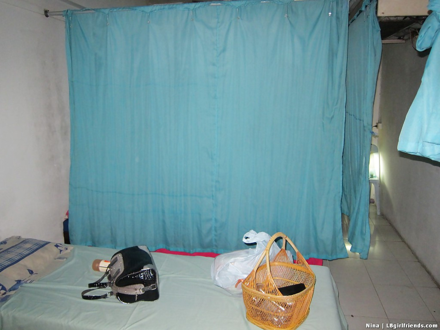 Solo Asian shemale Nina bends over for cumshot on her tranny ass
