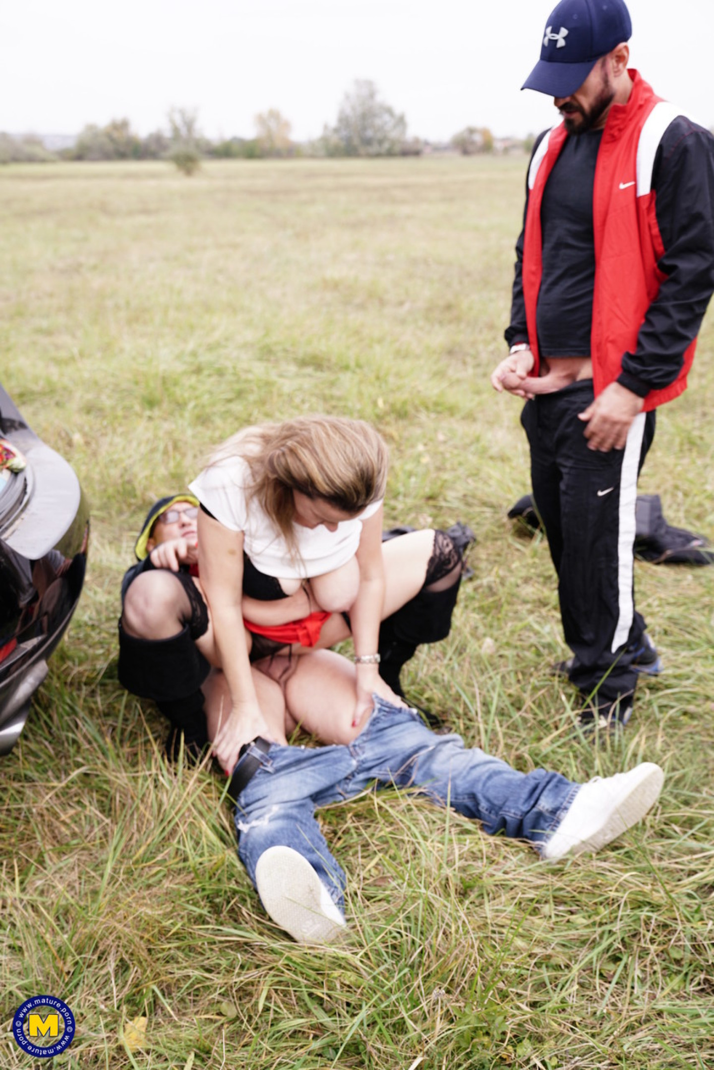 Busty mature British slut Eva Jayne gets gangbanged & facialed outdoors