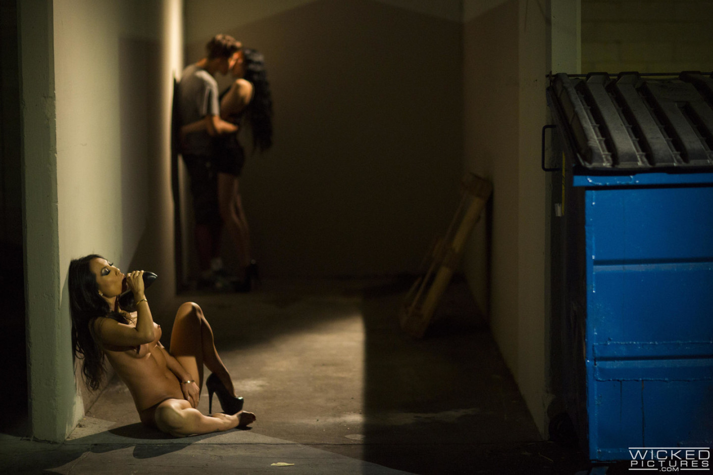 Sexy Asian pornstar Asa Akira masturbates in the hallway in front of a couple