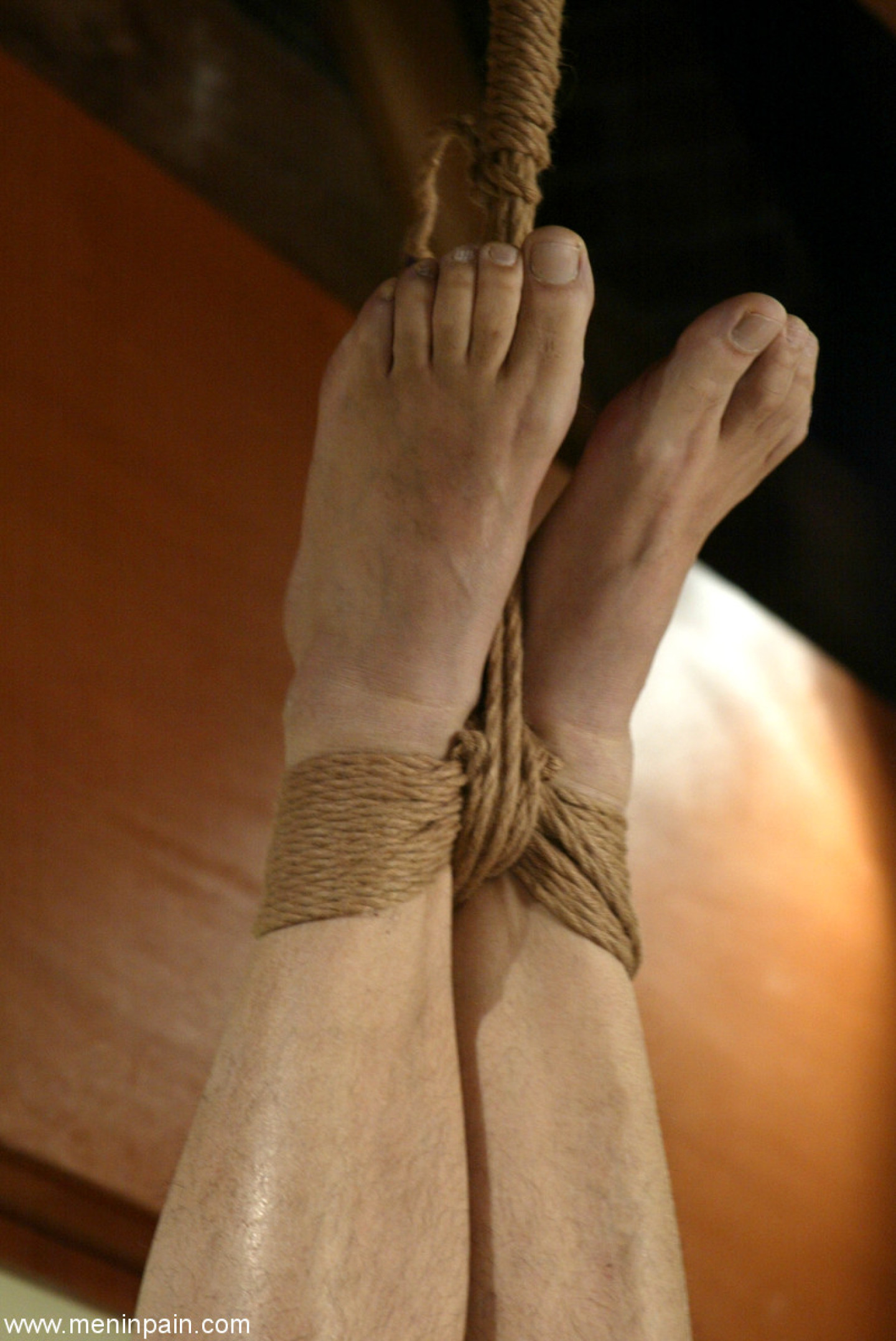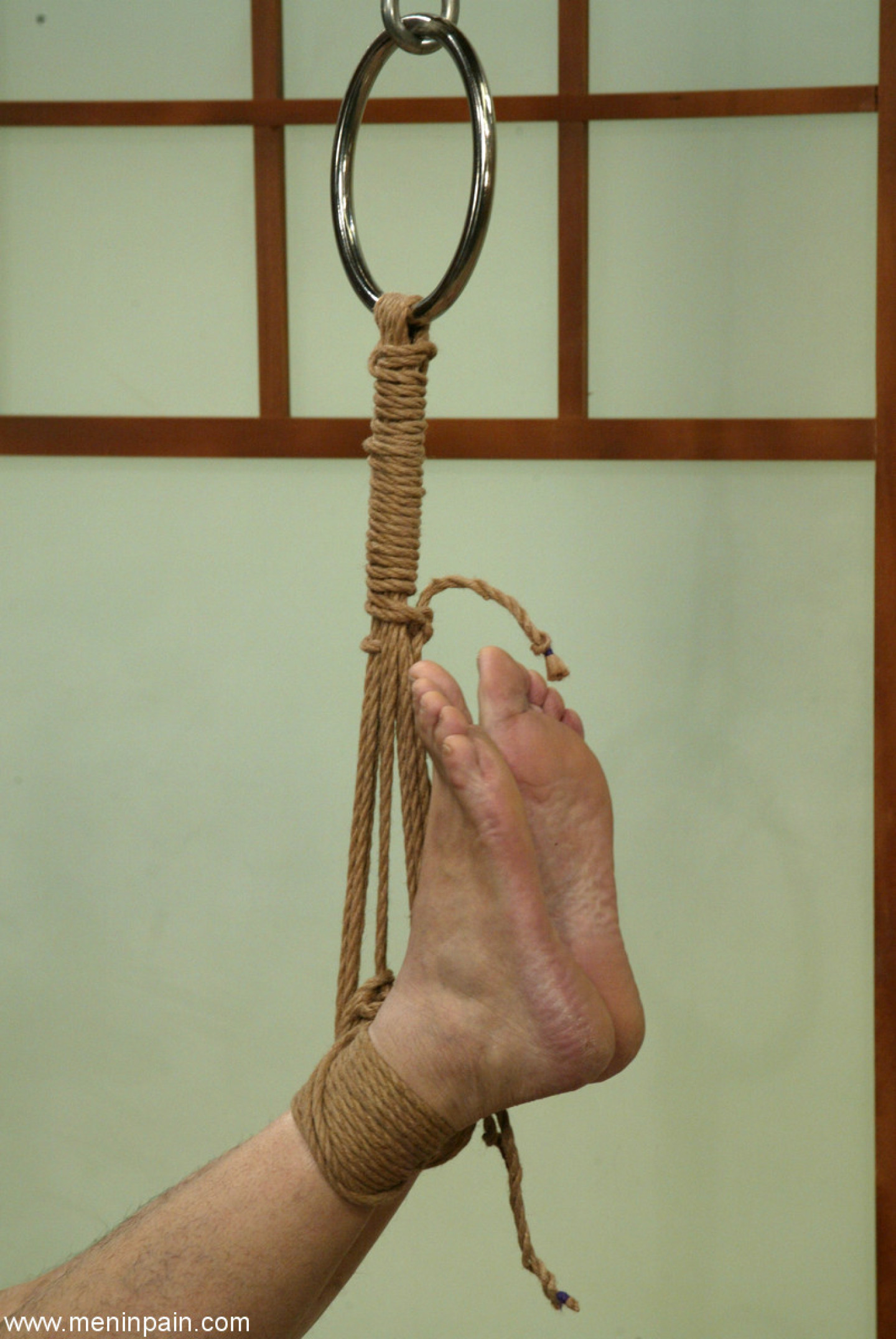Classy dominatrix Janay in suit & heels suspends naked male sub upside down