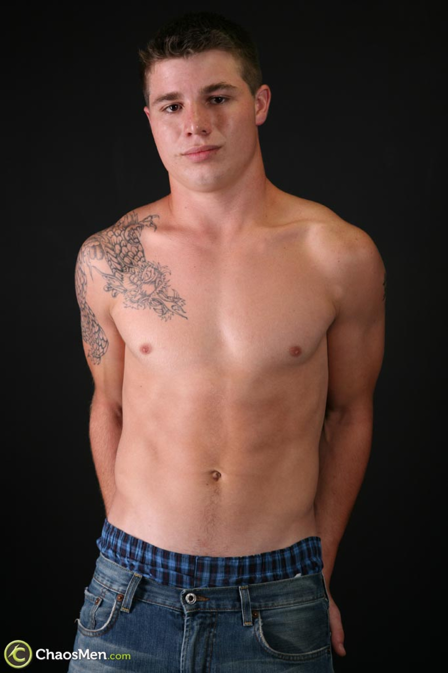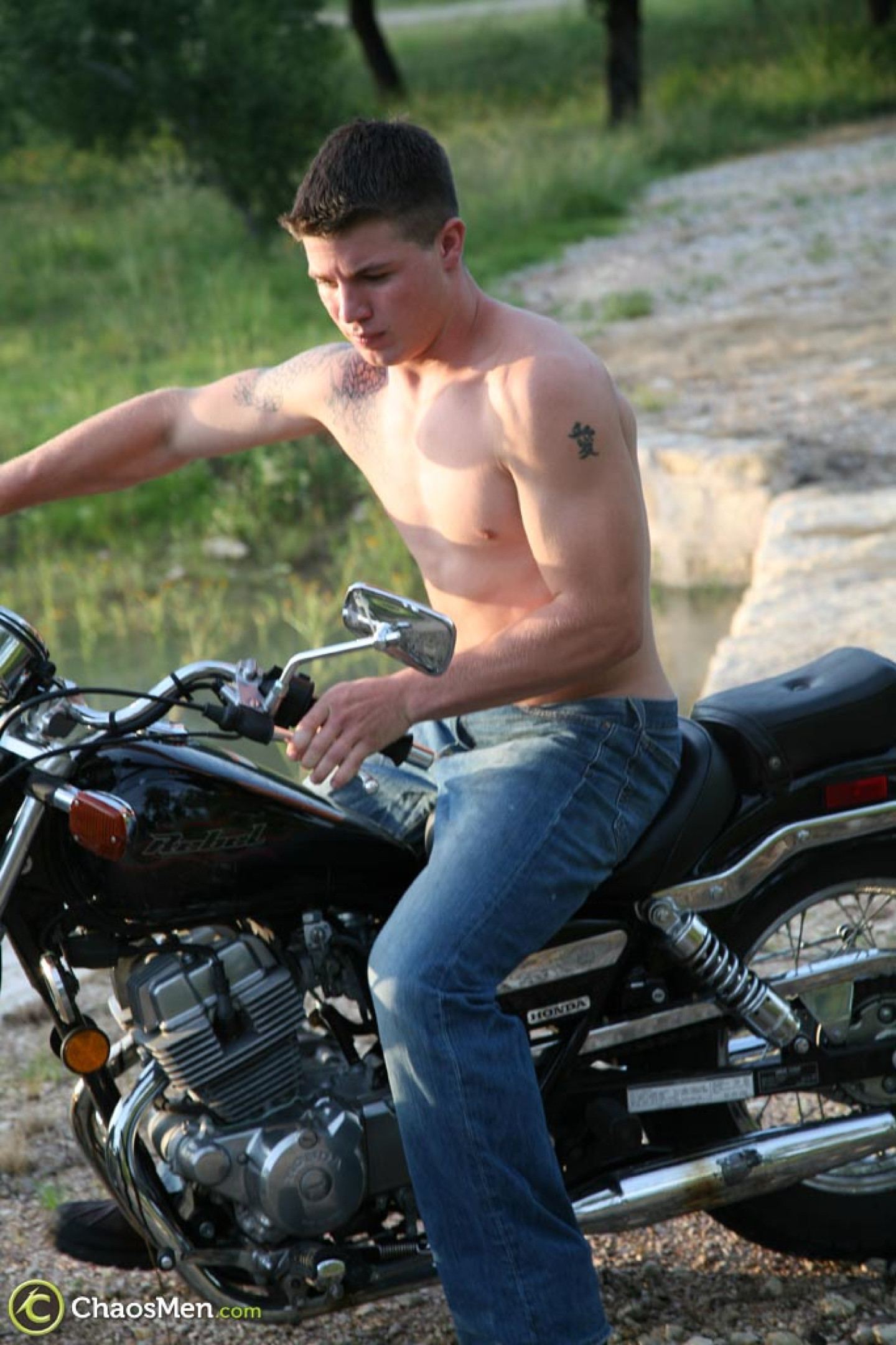 Inked gay biker Caleb unveils his sexy body and jerks off in a solo