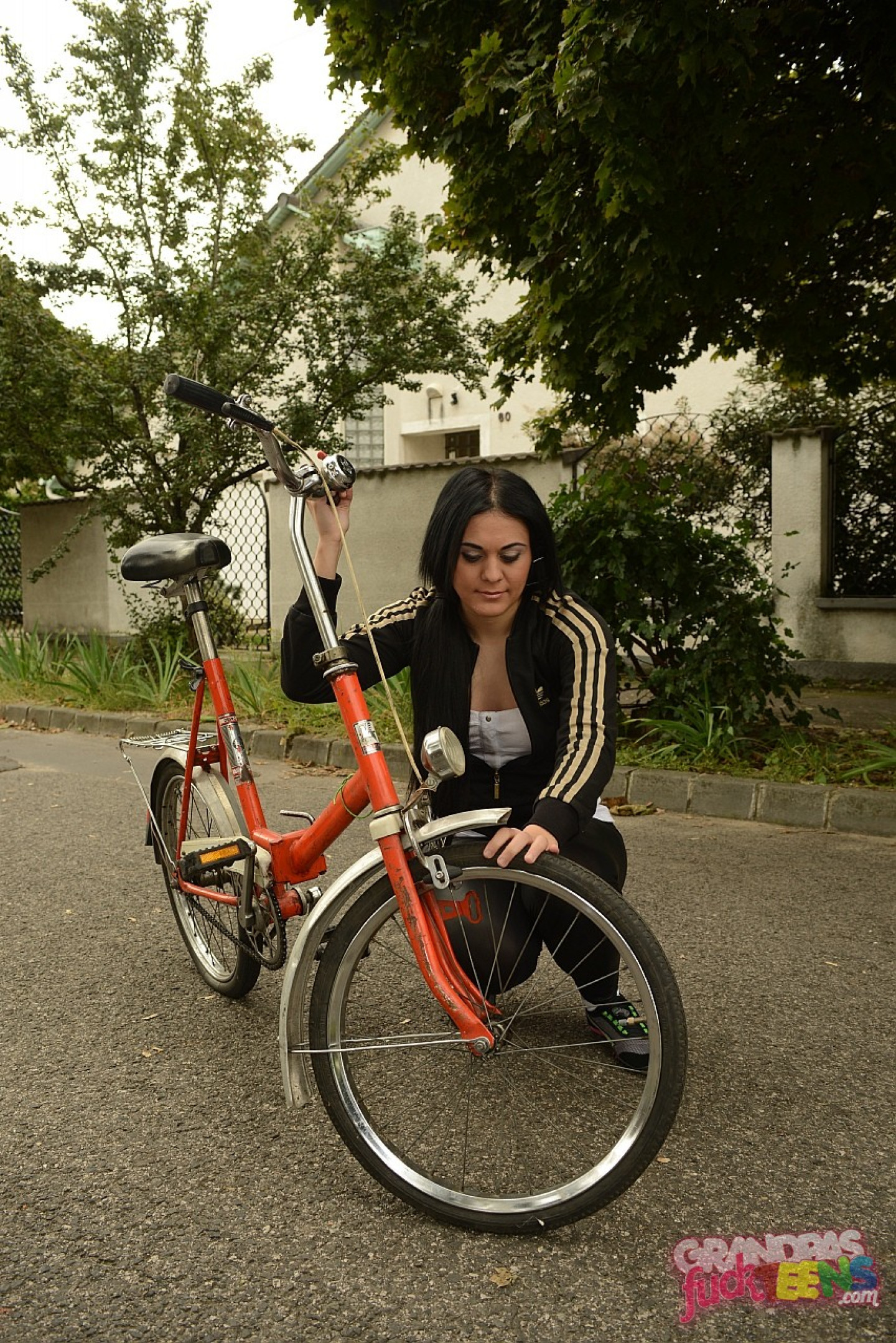 Black haired teen Marsha Cortez kneels on old handyman and takes dick in twat