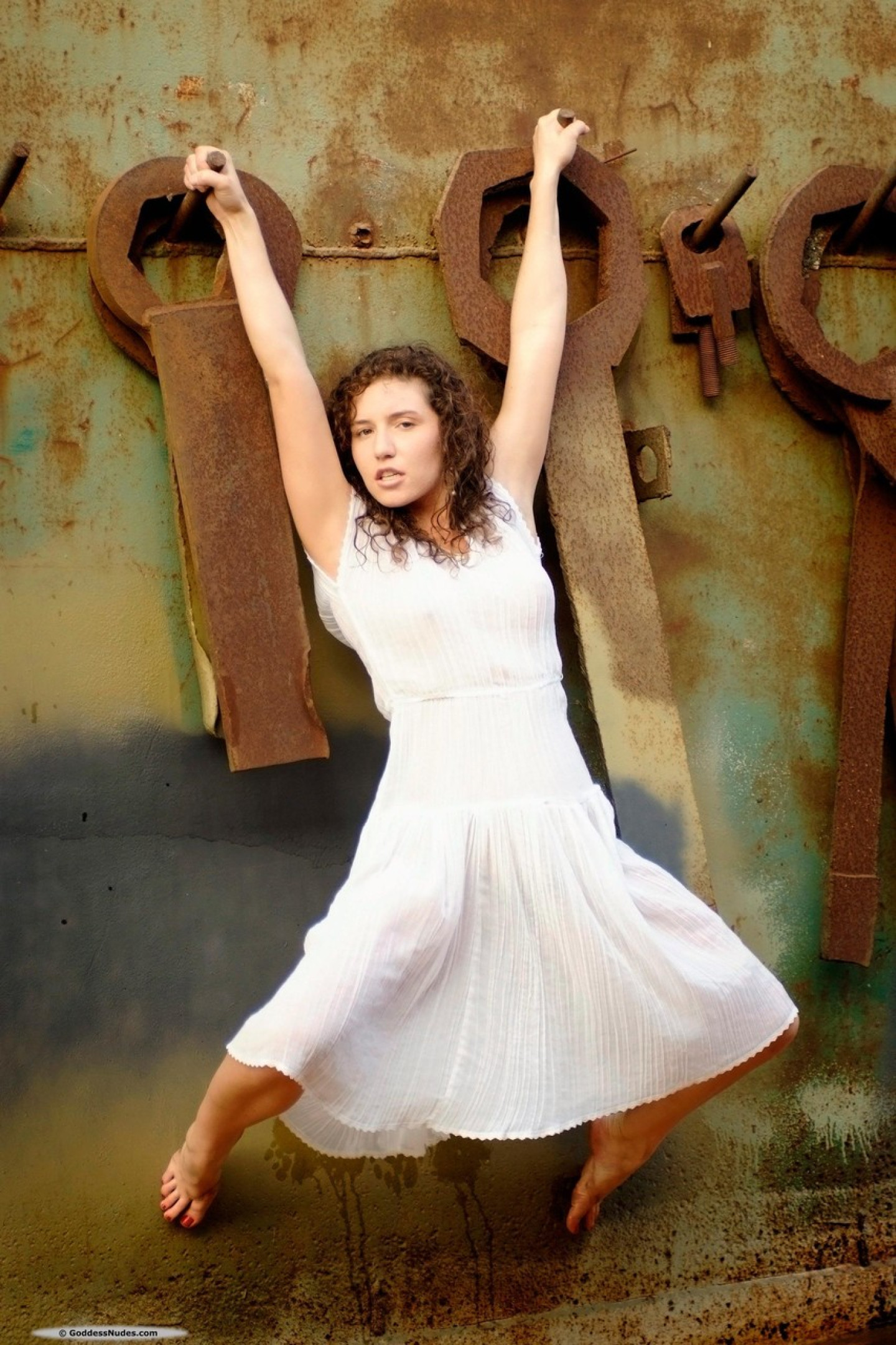 Sensual Sativa with her great smile poses hairy pussy naked at abandoned place