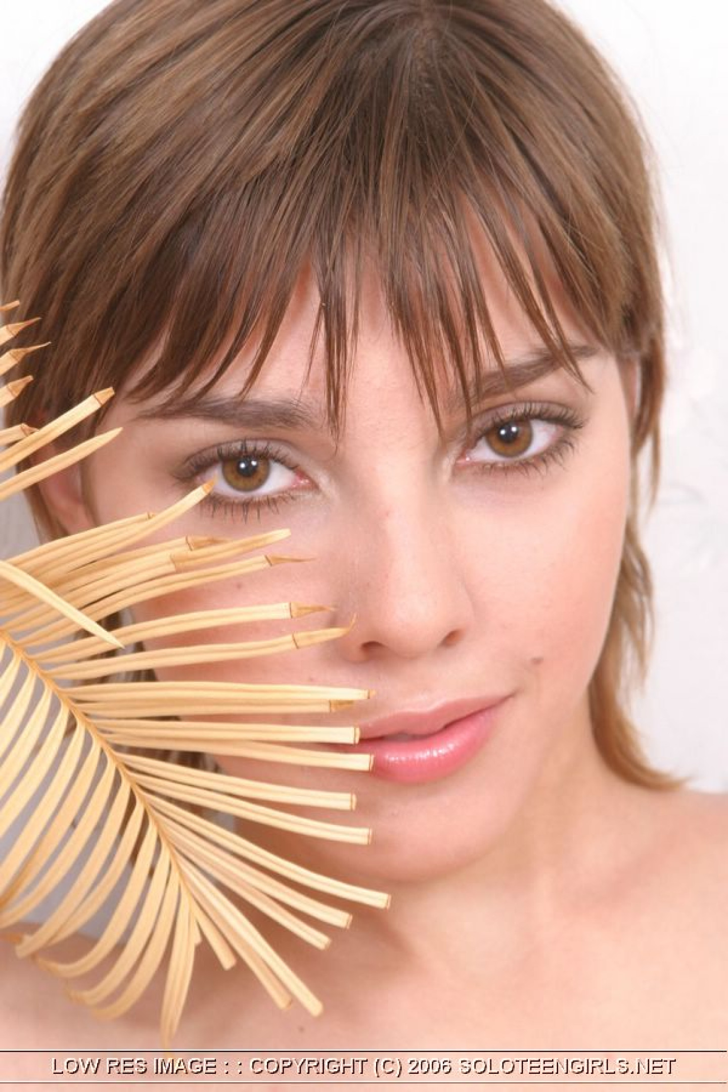 Short haired teen beauty holds a dried fern after getting totally naked