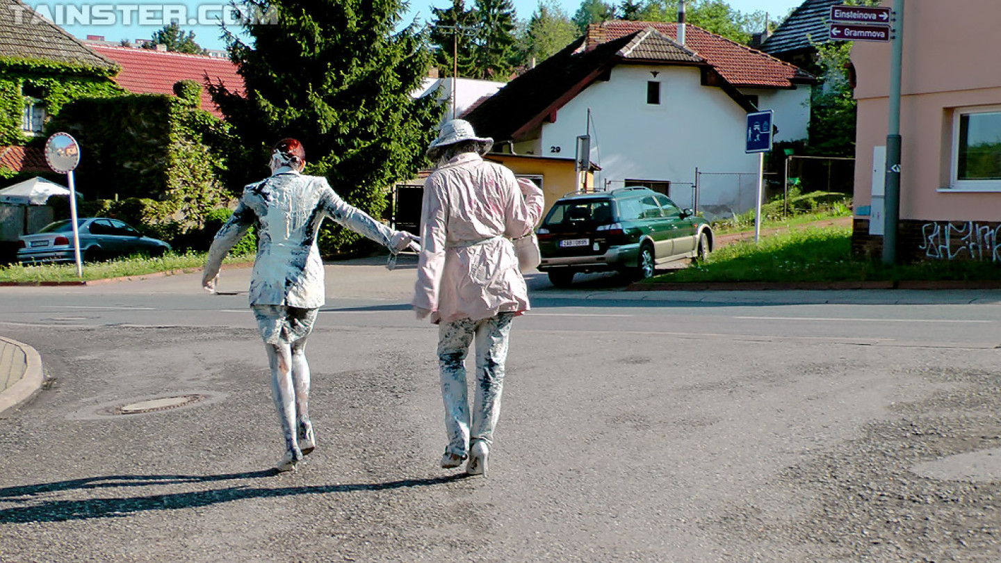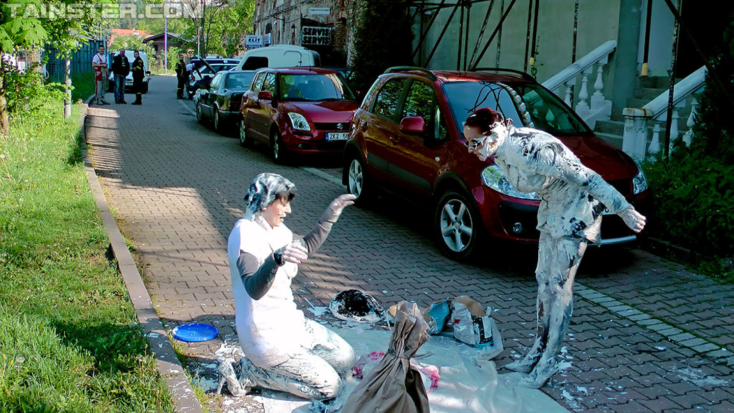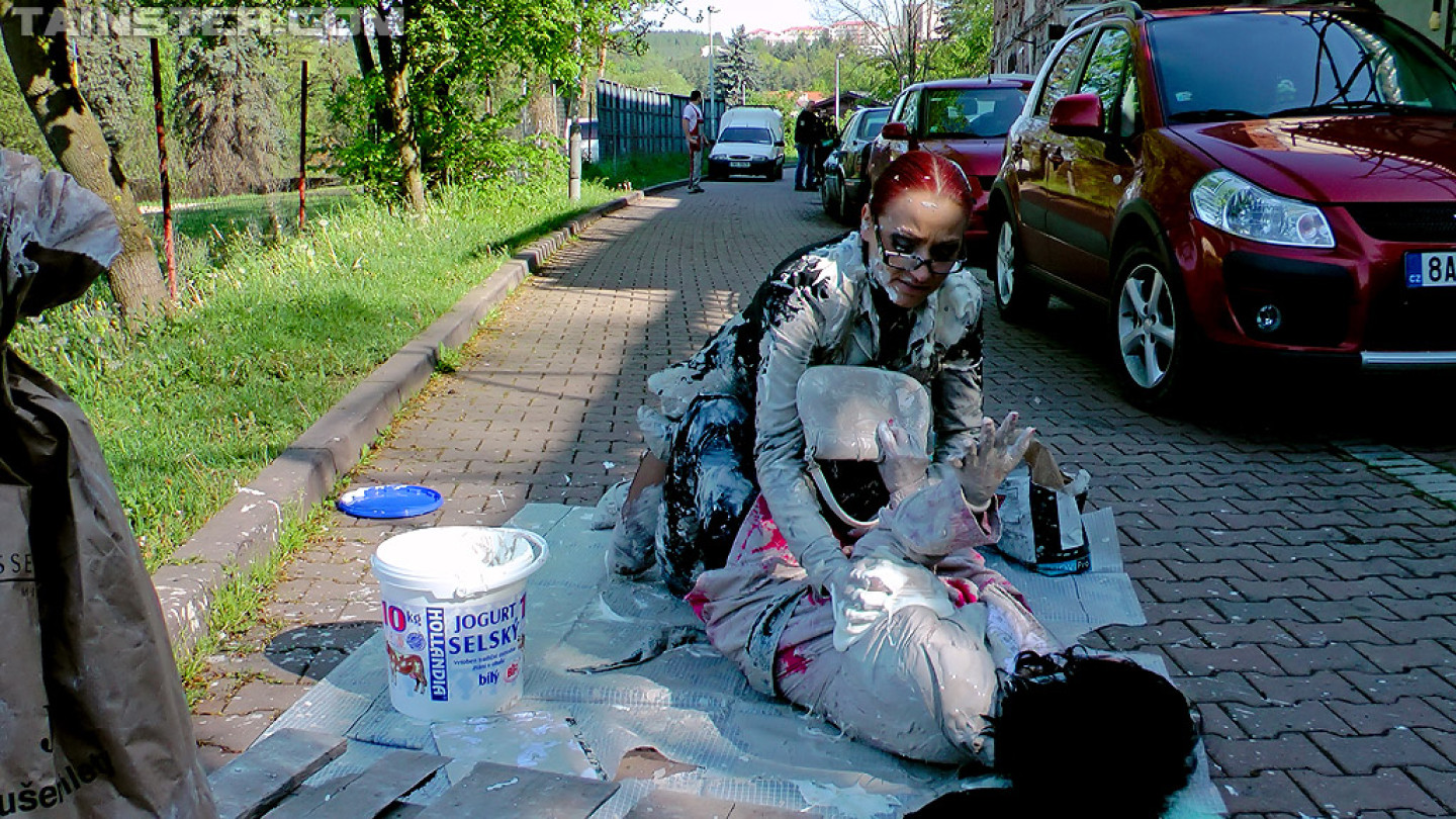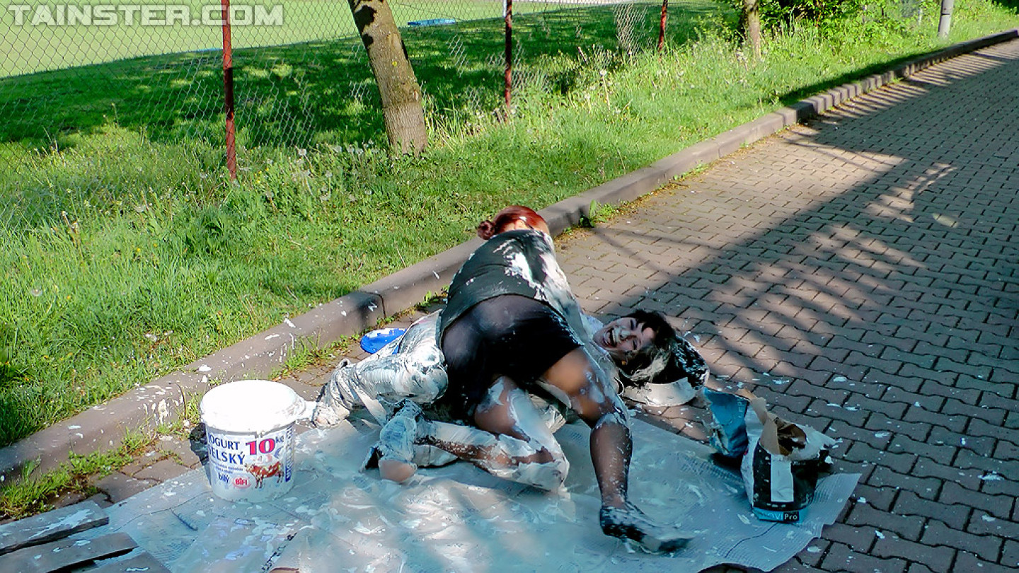 Fully clothed women cover each other in yogurt on a city sidewalk
