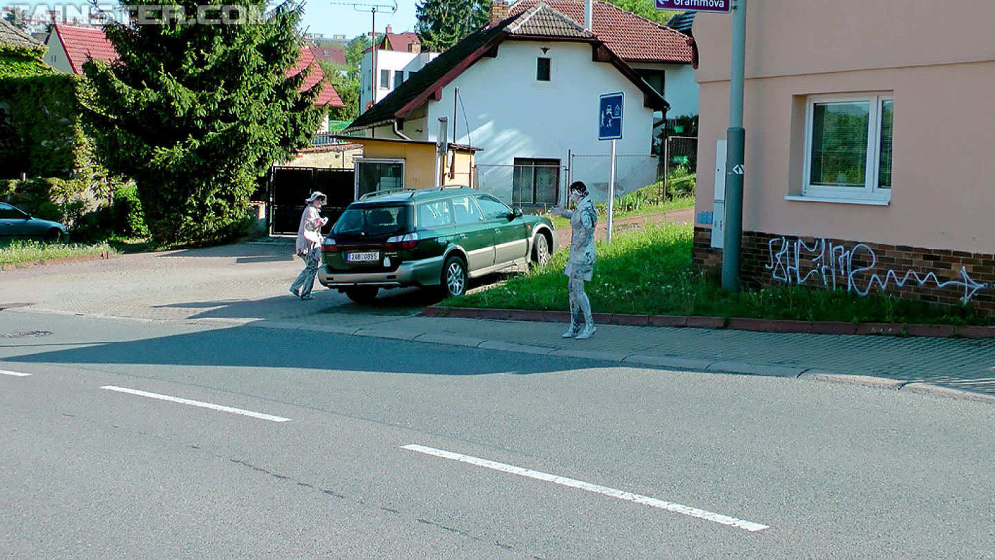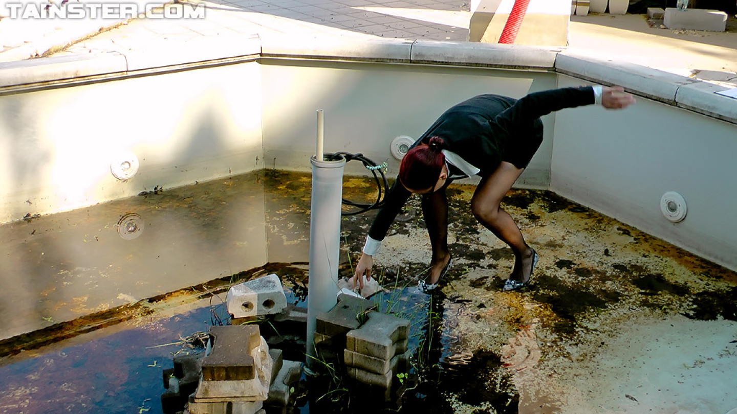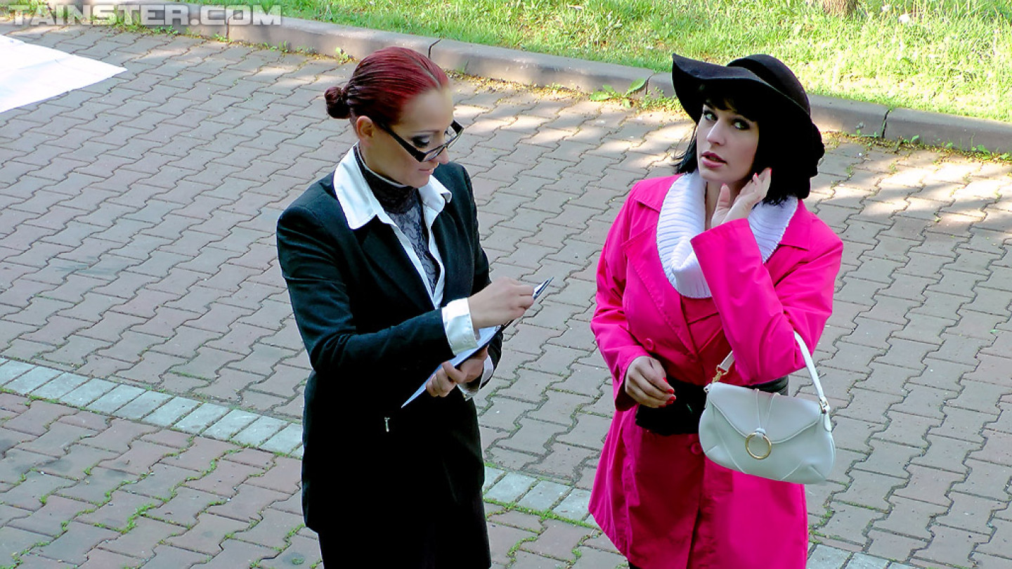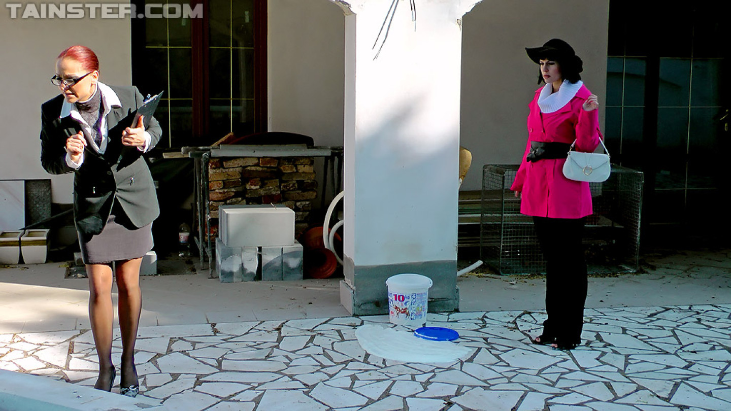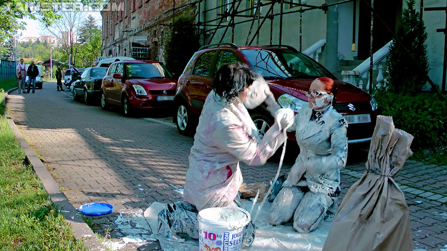 Fully clothed women cover each other in yogurt on a city sidewalk