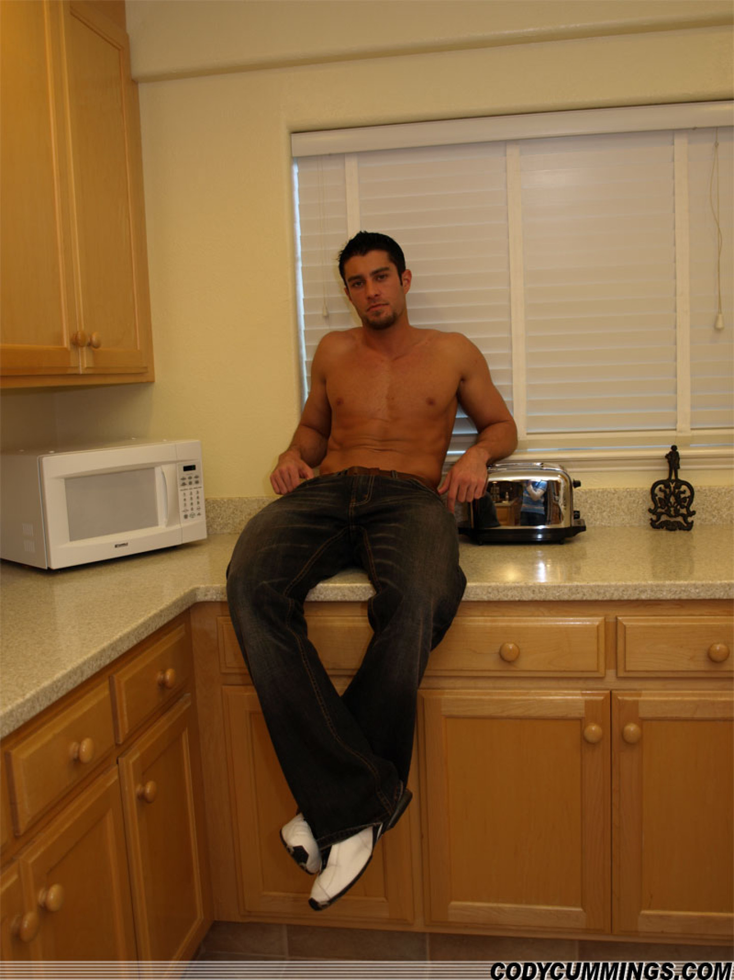 Sexy muscular stud Cody Cummings wanks his big rod on the kitchen counter