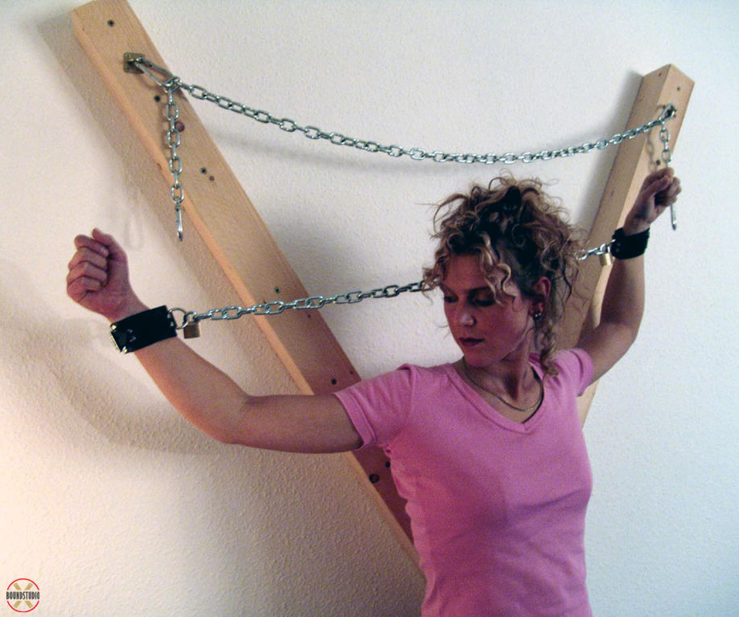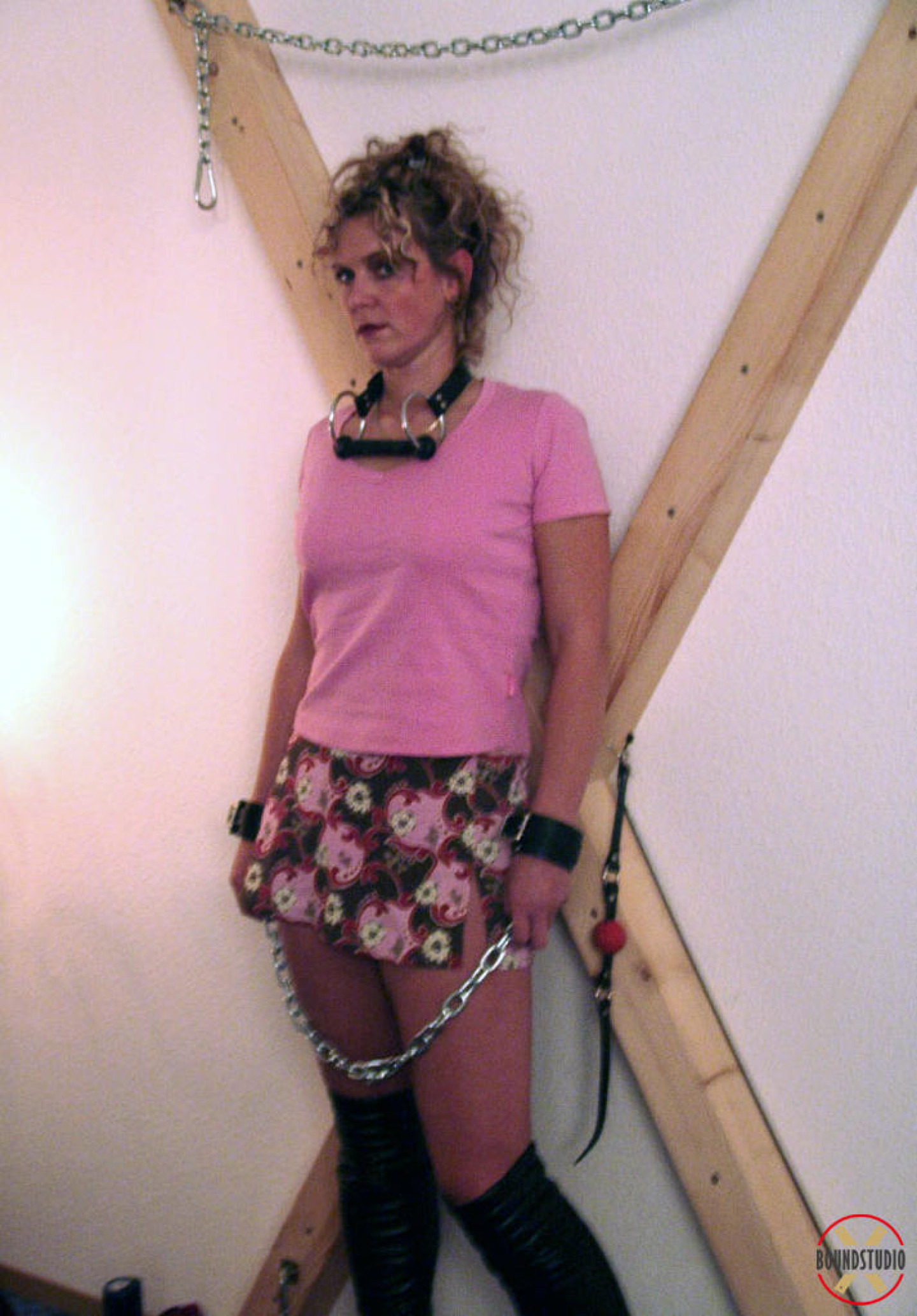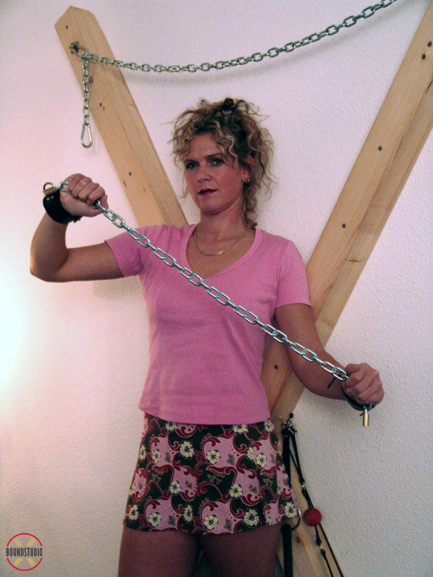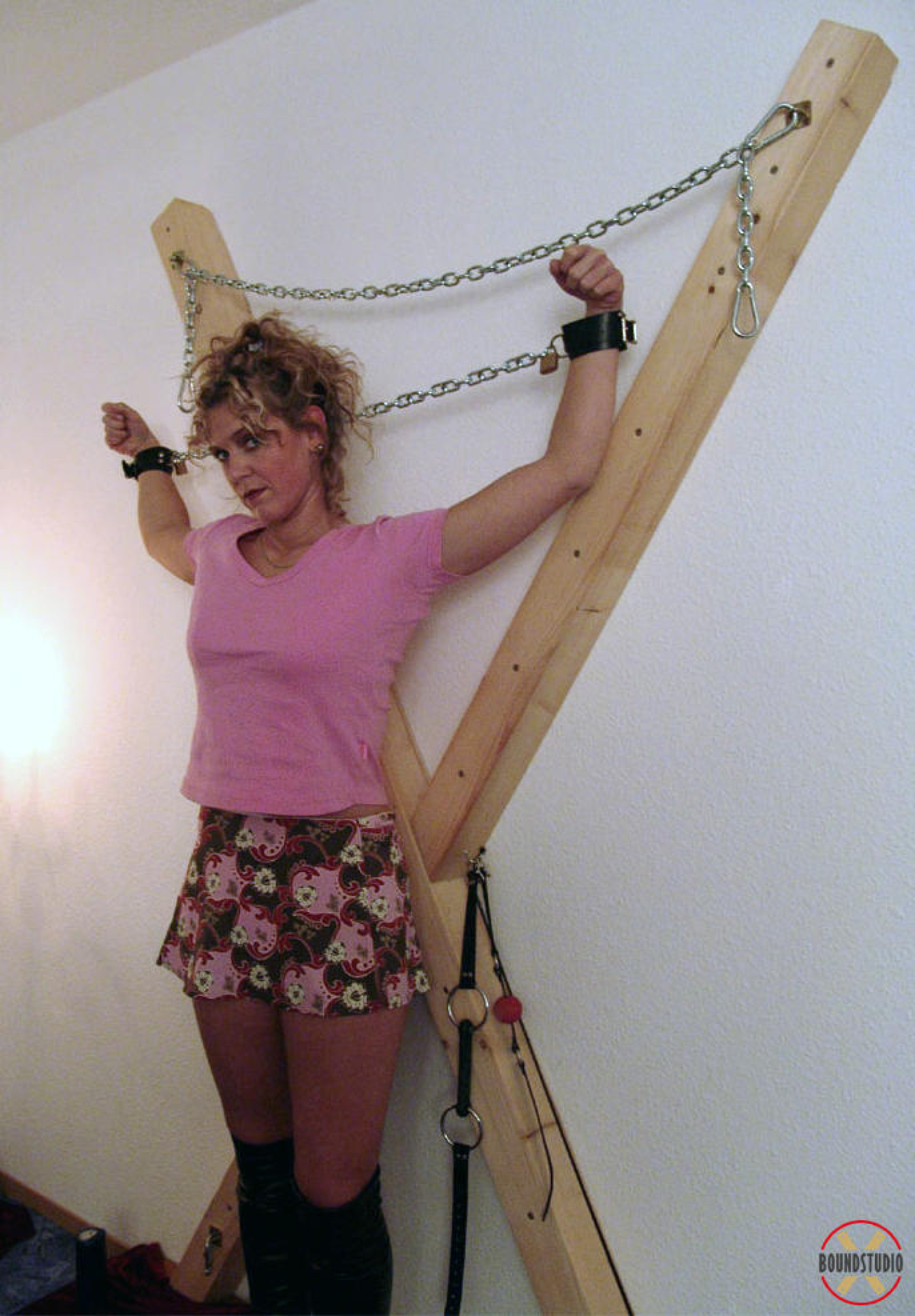 Clothed female Blonde Lea is attached to a St Andrew's Cross