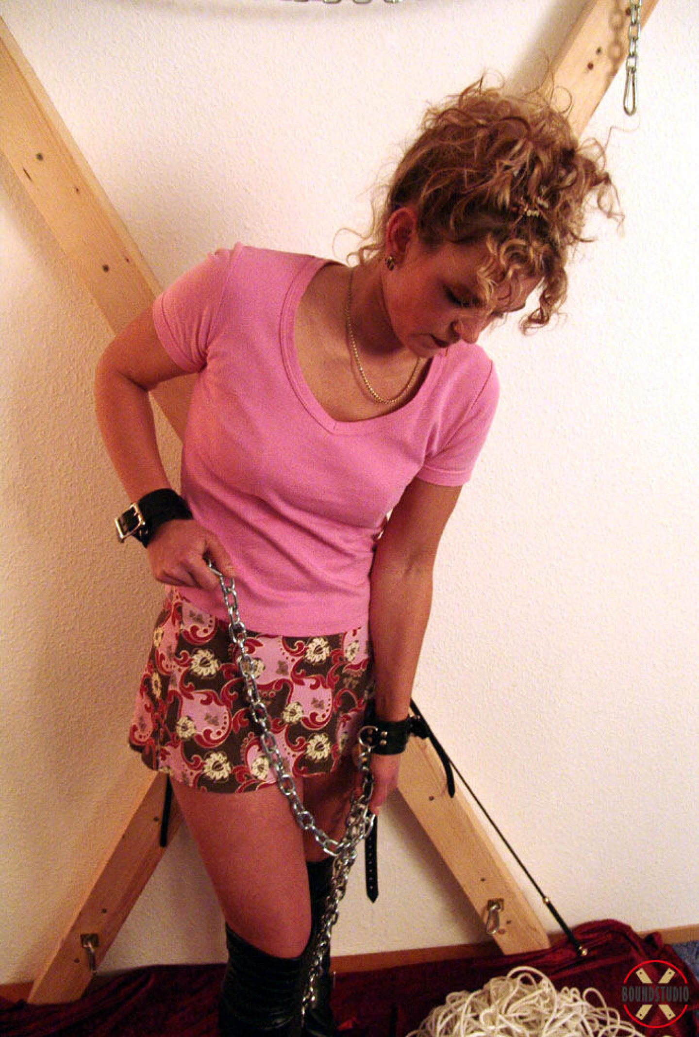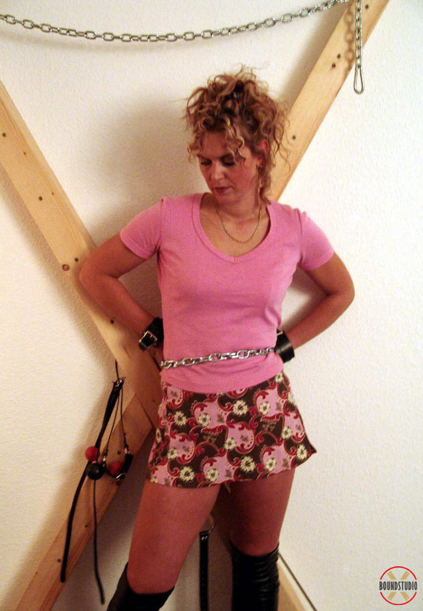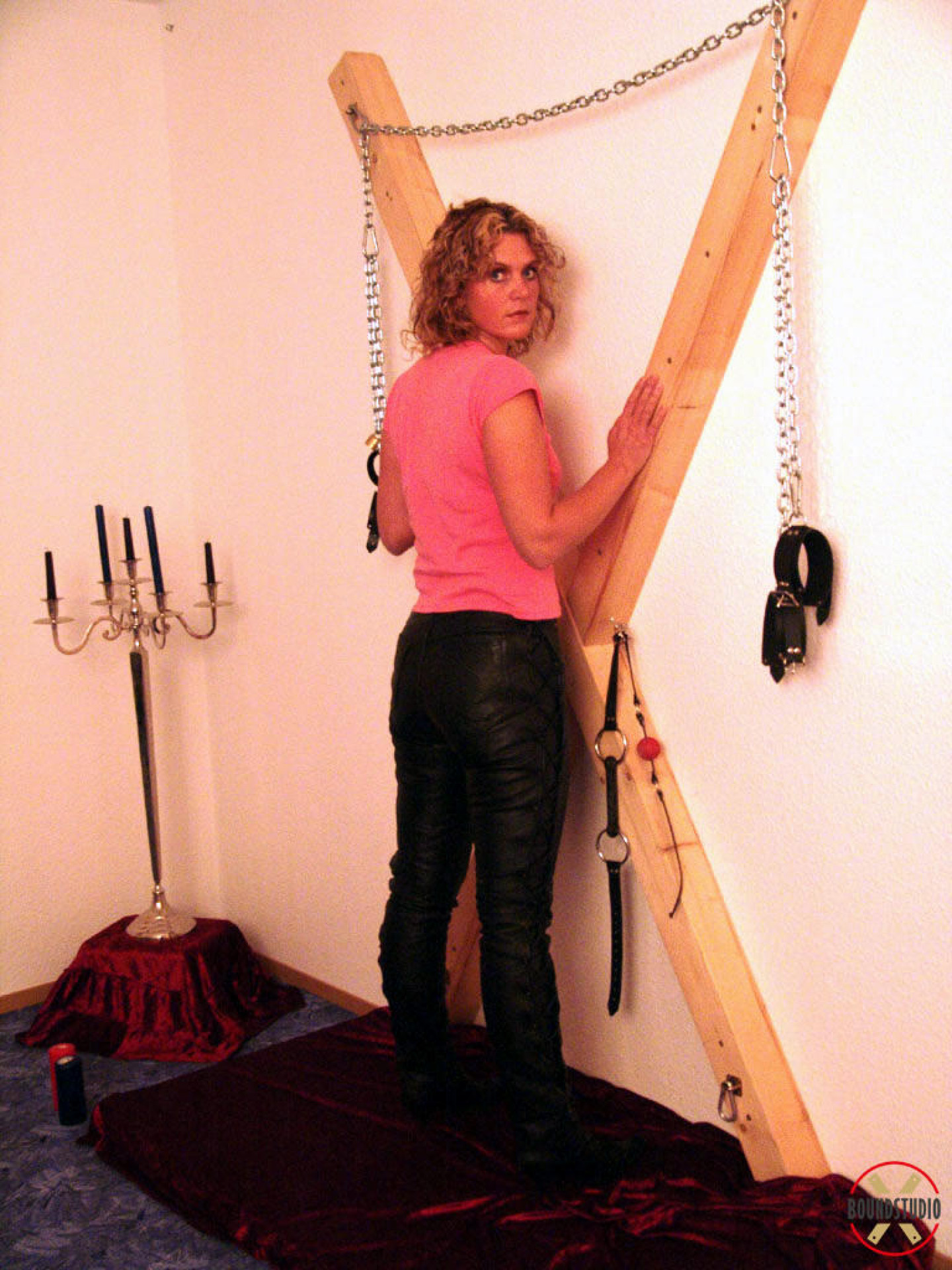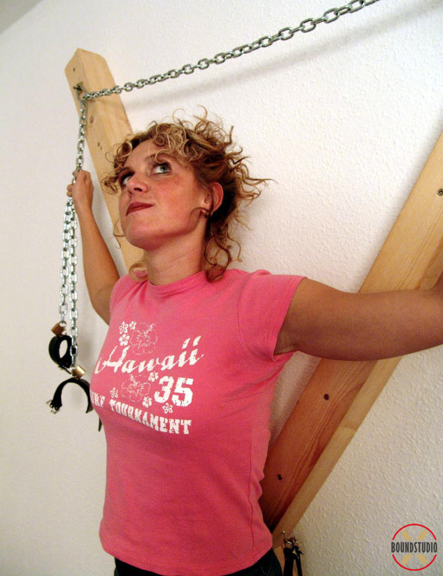 Clothed female Blonde Lea is attached to a St Andrew's Cross