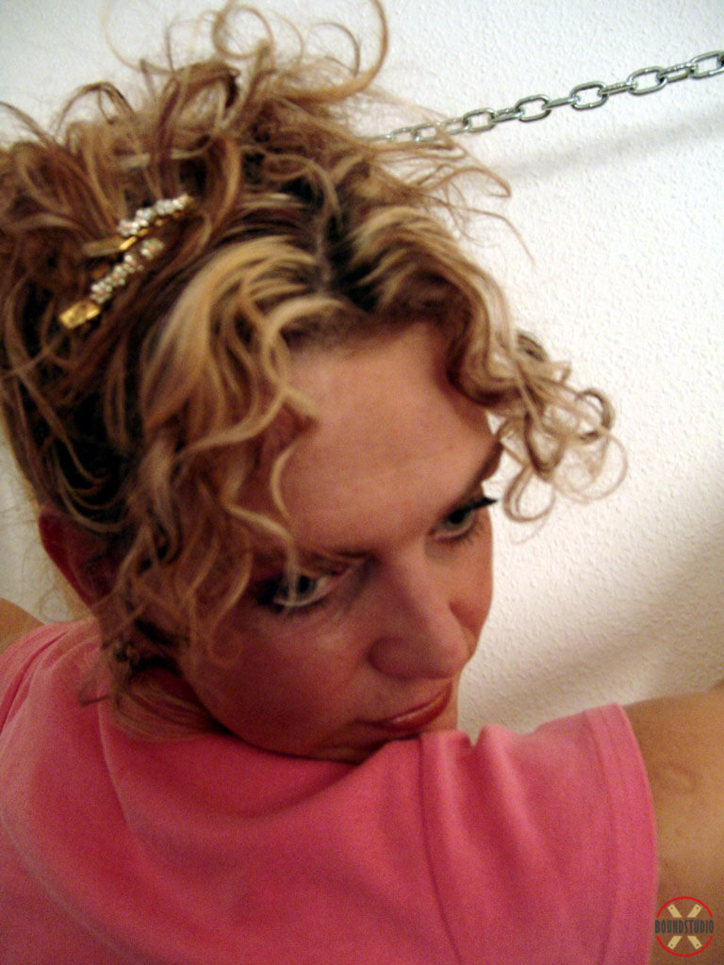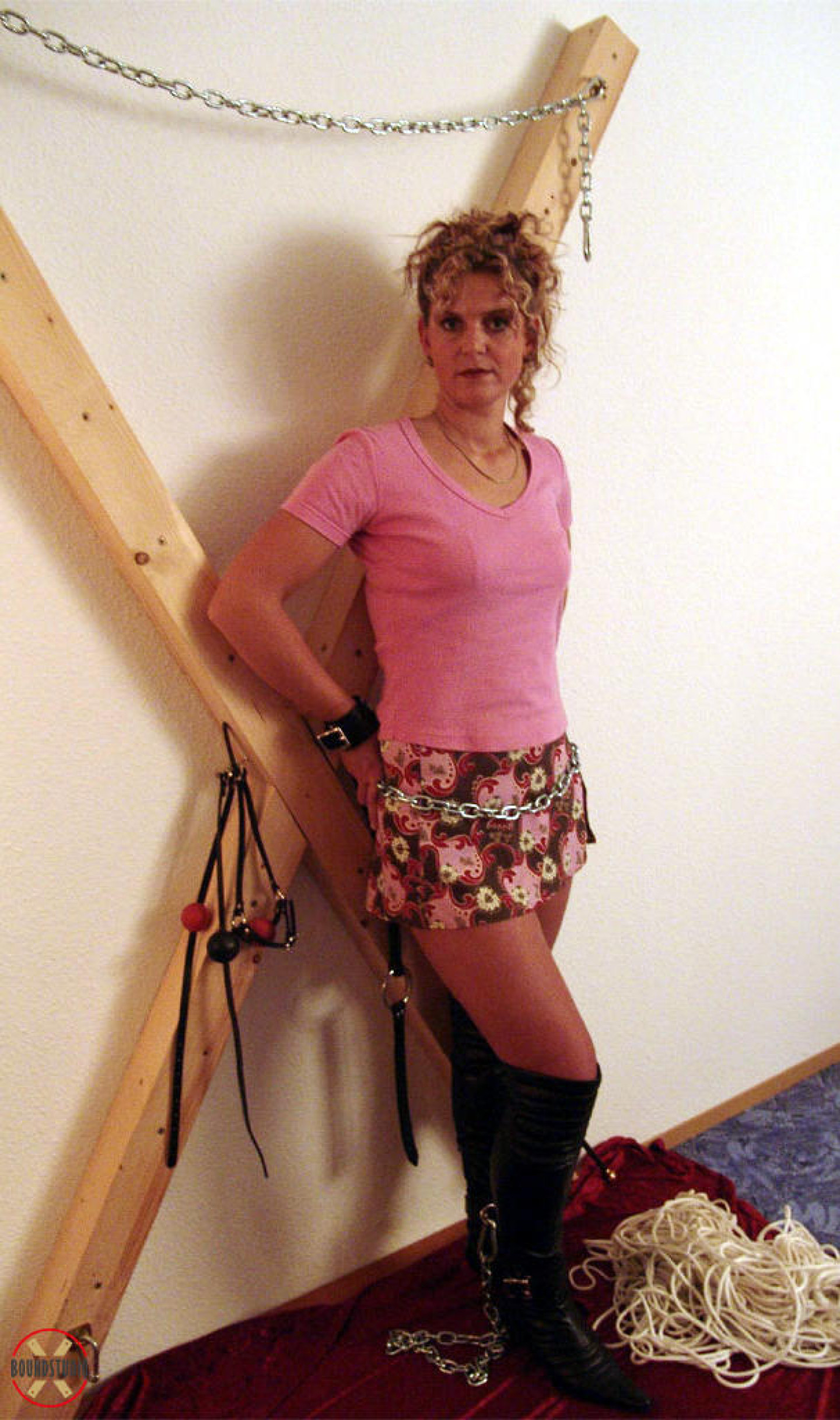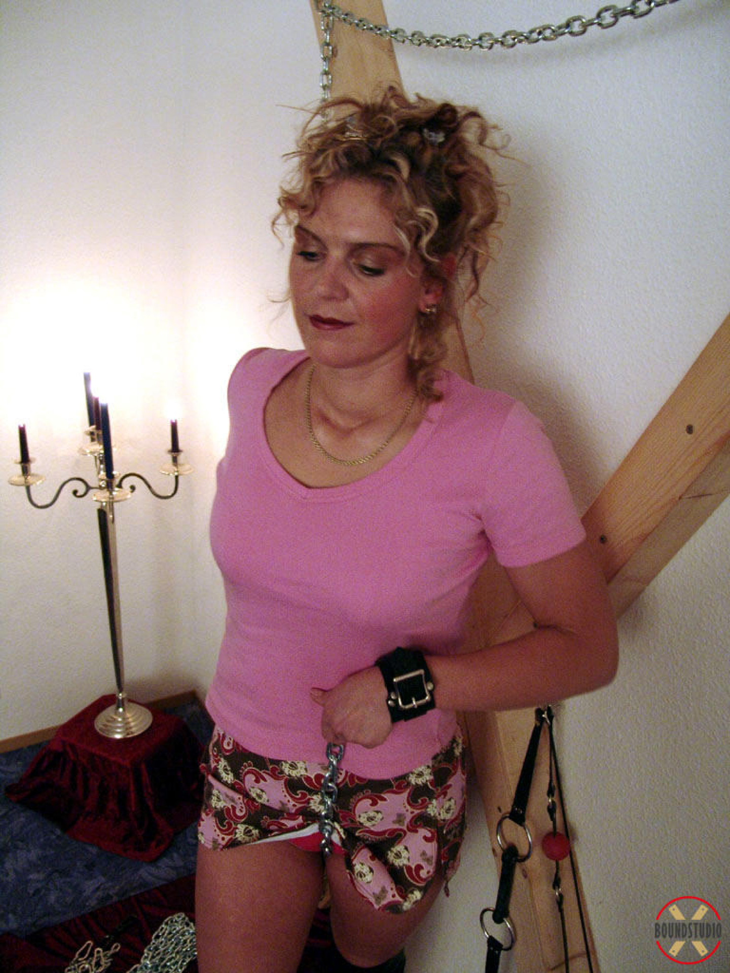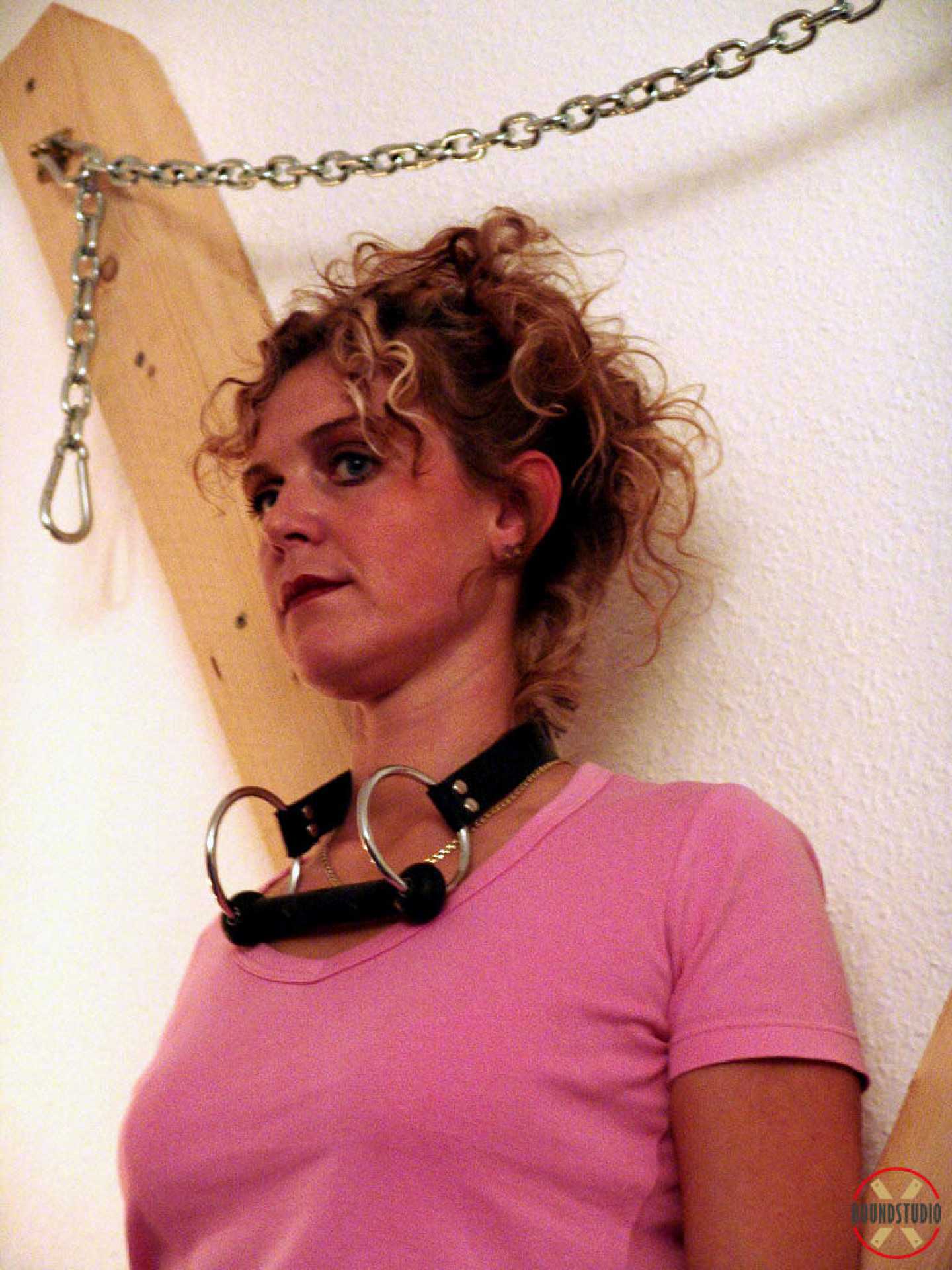 Clothed female Blonde Lea is attached to a St Andrew's Cross