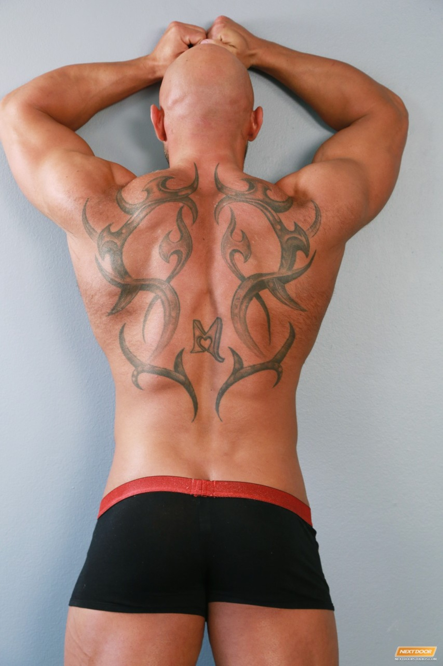 Kinky muscular gays strip and bang an inked petite guy in a threesome