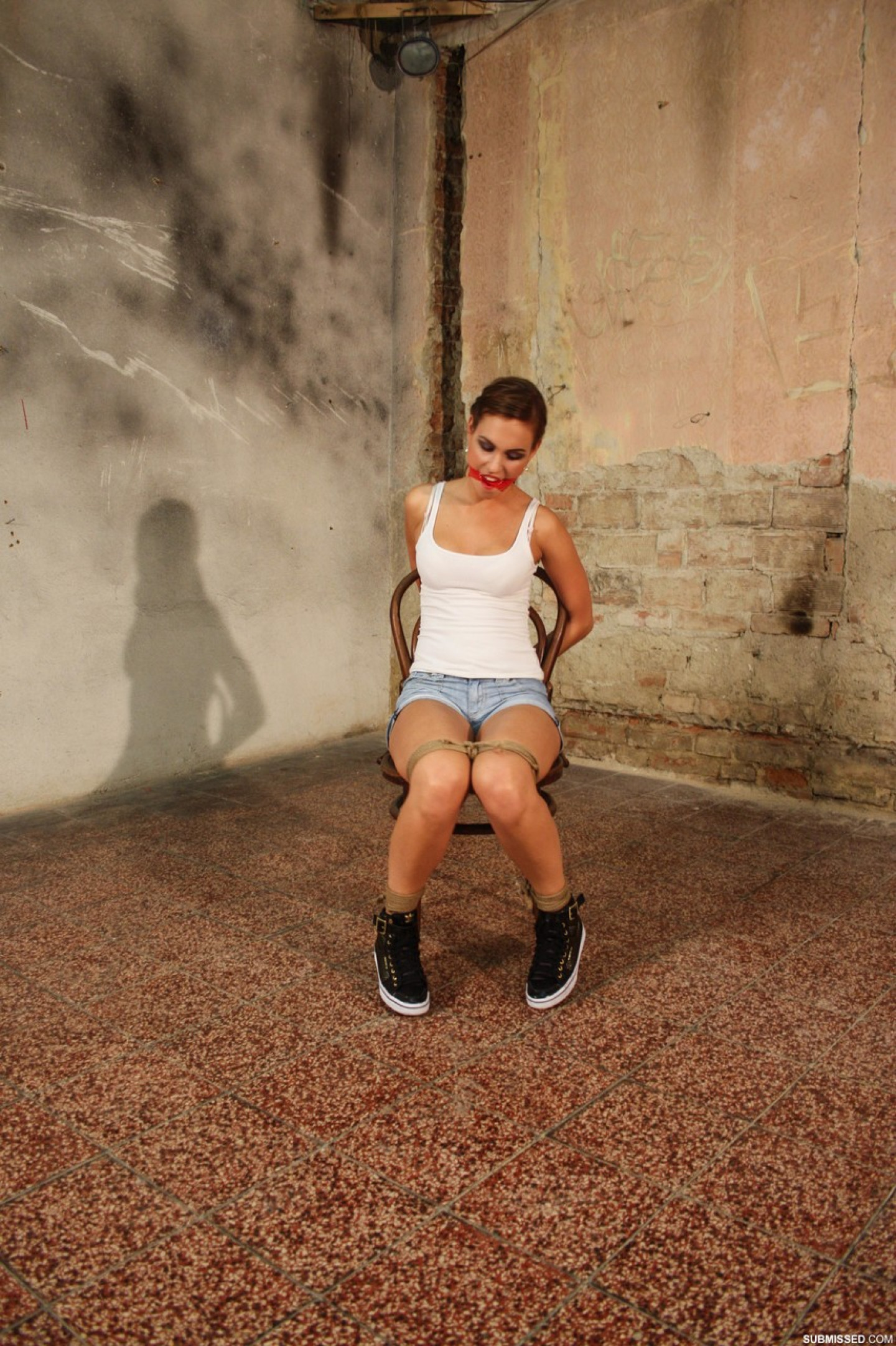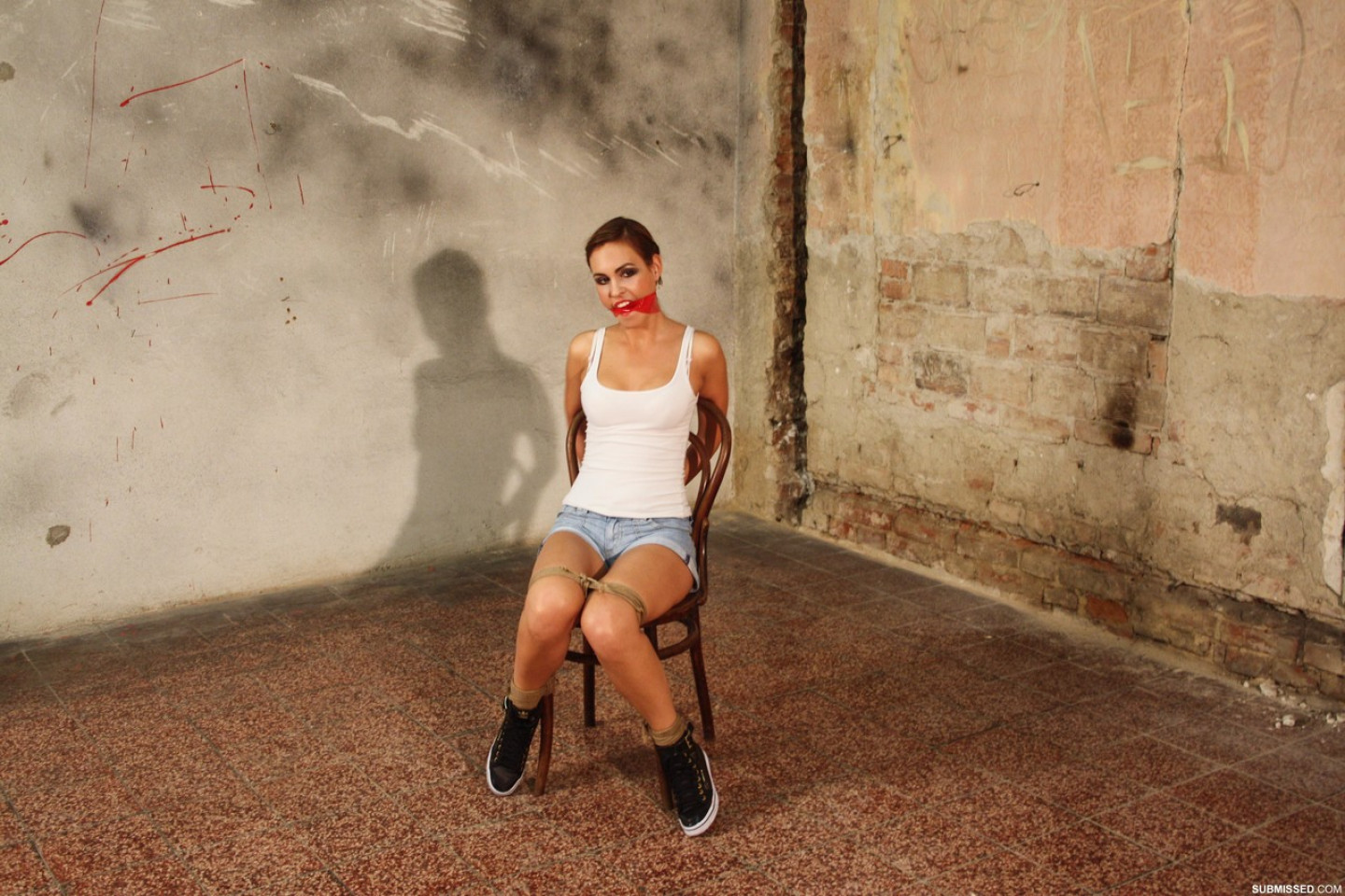Gorgeous brunette poses tied to a chair in jean shorts and a white tank top