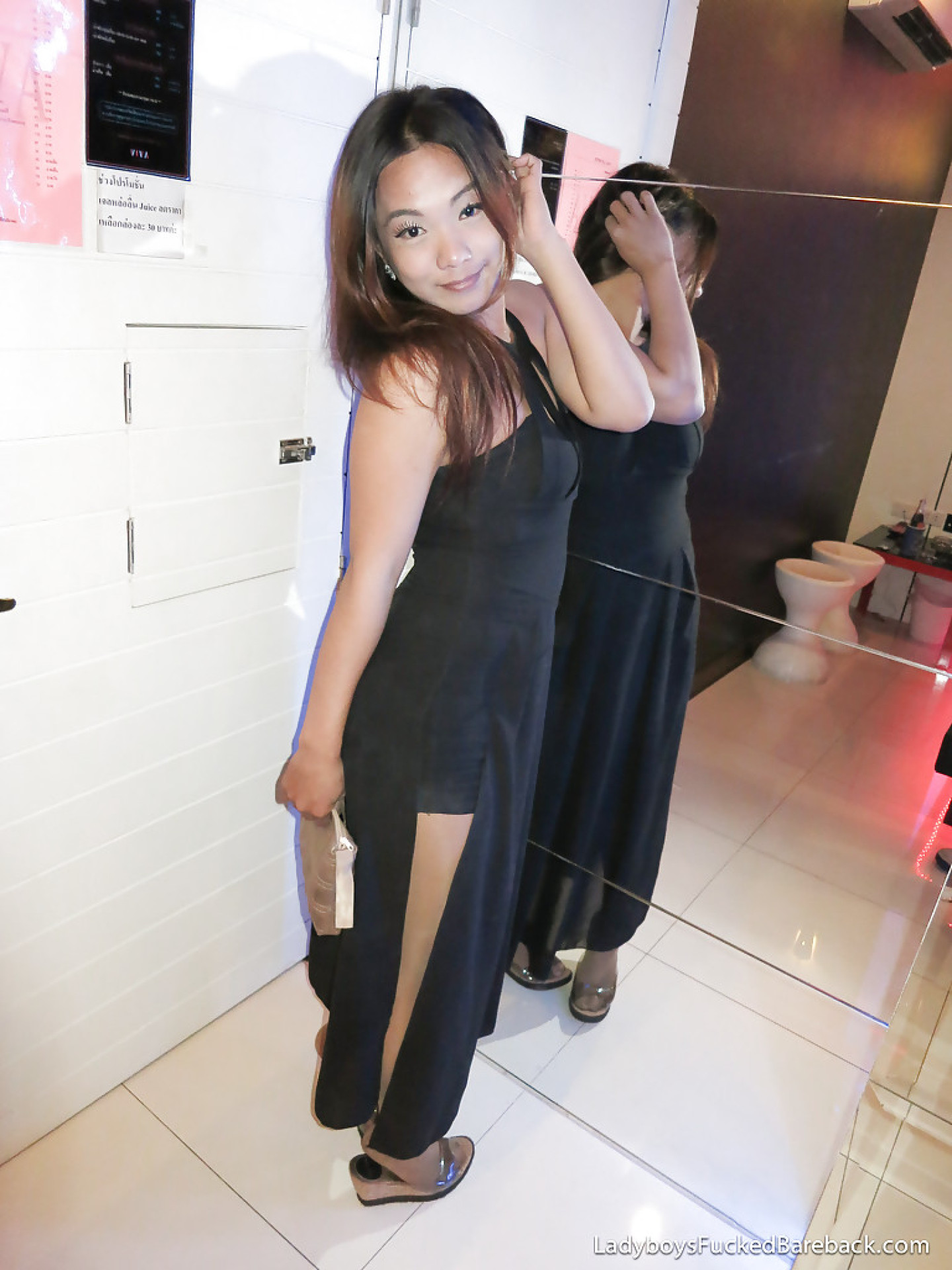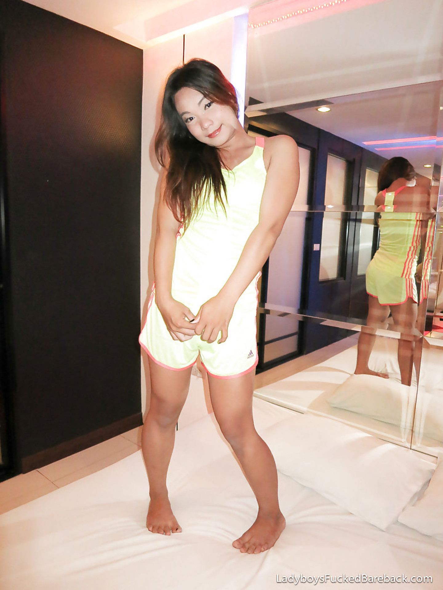 Young Asian Ladyboy Mina taking bareback cock in hairy asshole