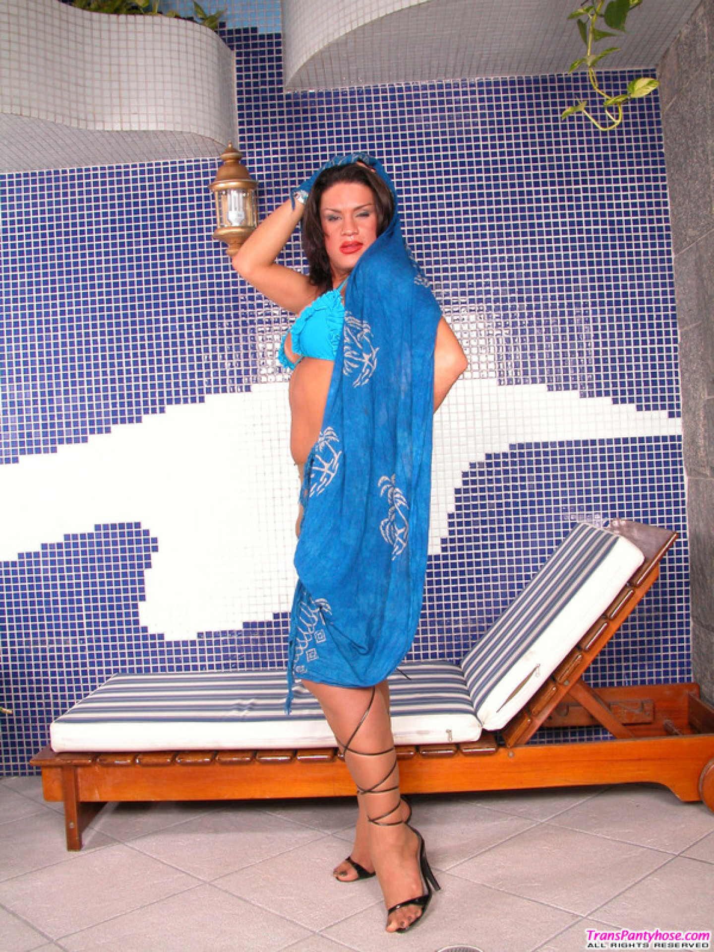 Smashing shemale in sheer to waist tights getting nasty right on the lounge