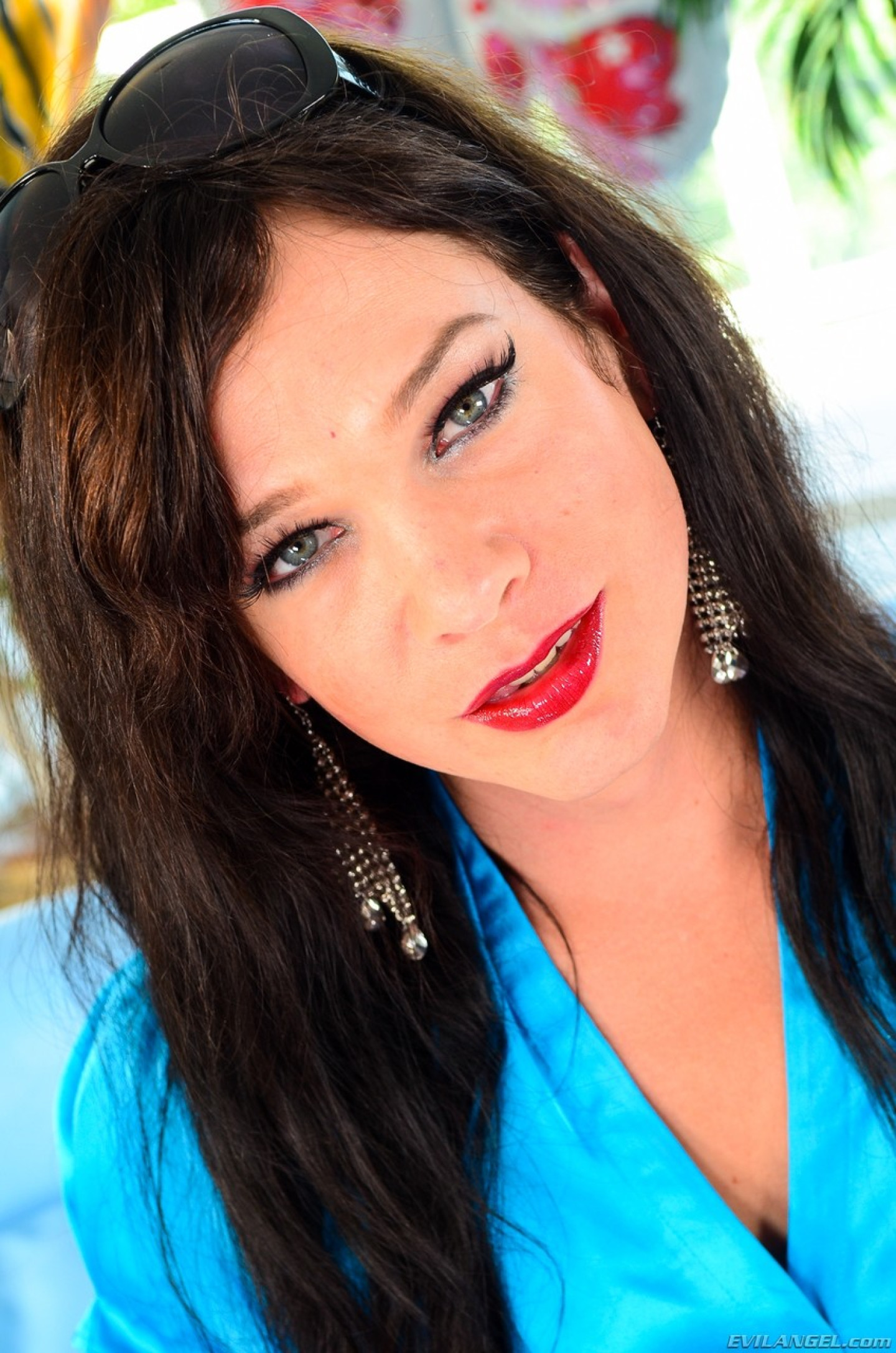 Gorgeous brunette shemale in fishnets bares tiny tits & impressive erection